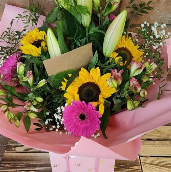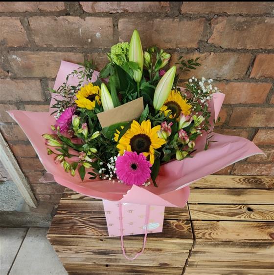 A beautiful bright bouquet, including Sunflowers and Lilys presented in a gift bag.