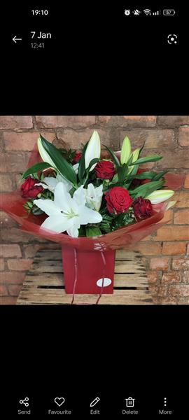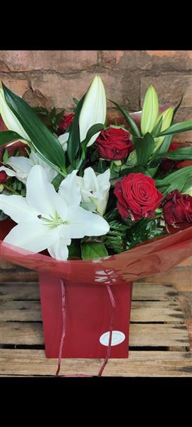 Six beautiful large headed red Roses and white Lilies, gift wrapped in an aqua pack.